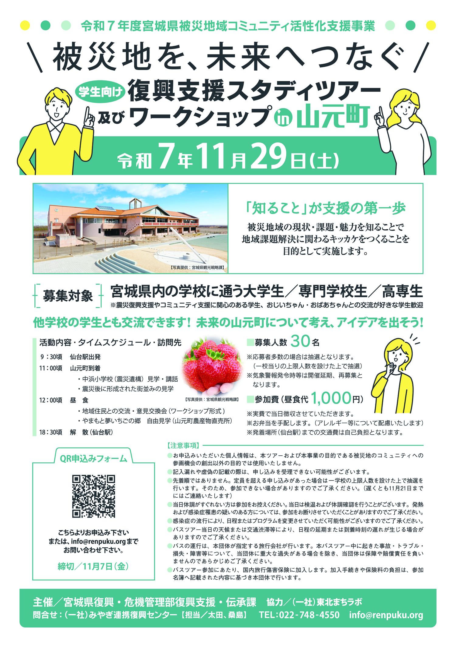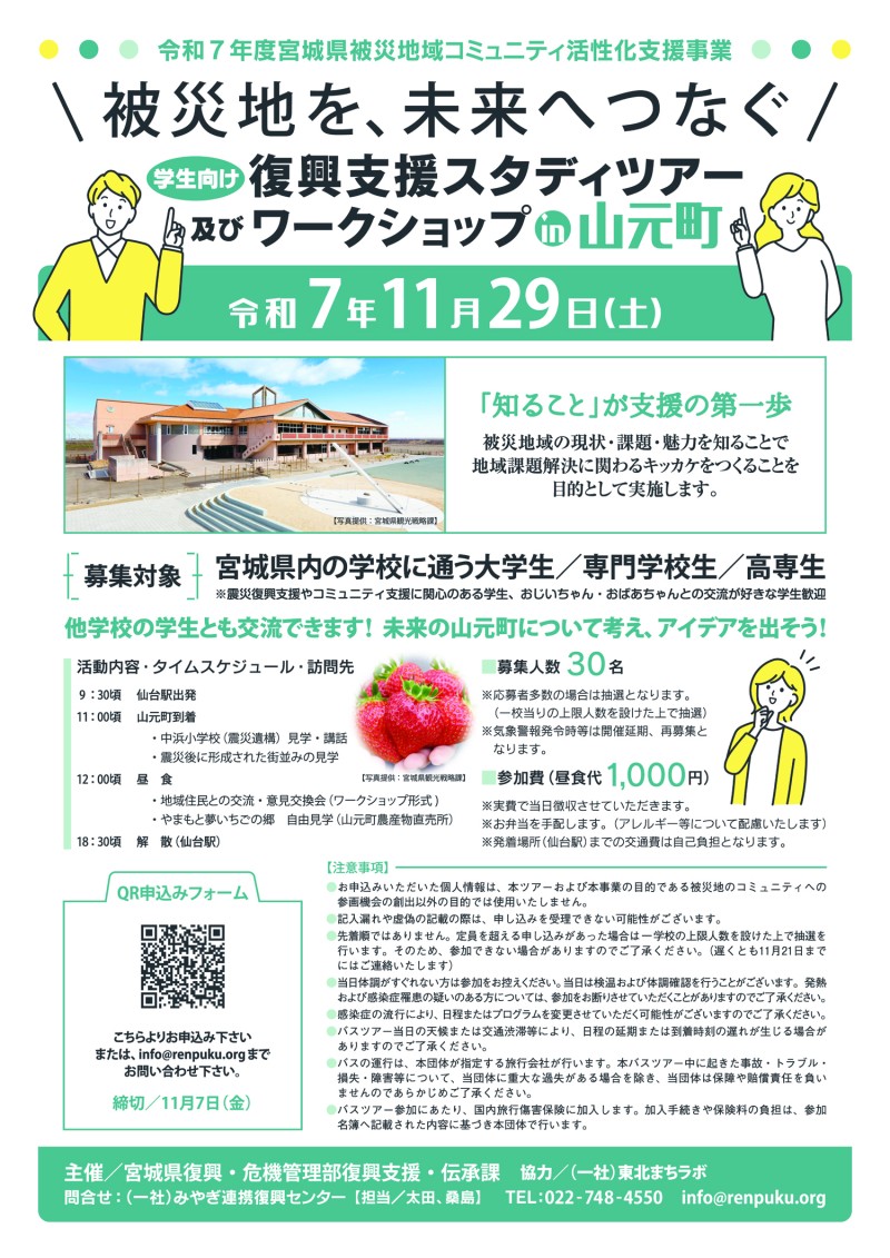 令和7年度宮城県被災地域コミュニティ活性化支援事業の一環として、宮城県内の学校に通う18歳以上の大学生、専門学校生、高専生を対象に上記ツアーが開催される。